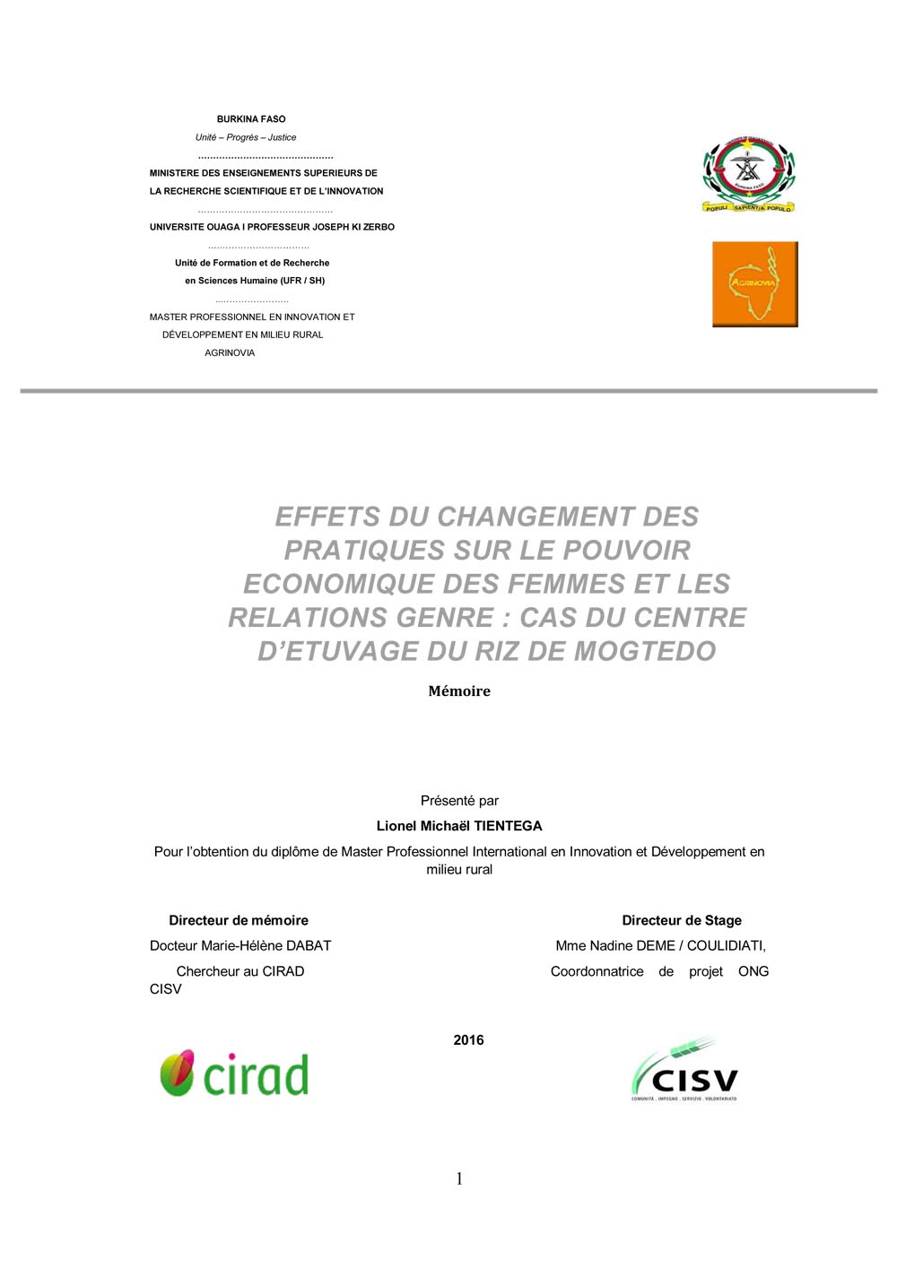 Effets de changement de pratiques sur le pouvoir économique des femmes et les relations genre: cas du centre d’etuvage du riz de Mogtédo