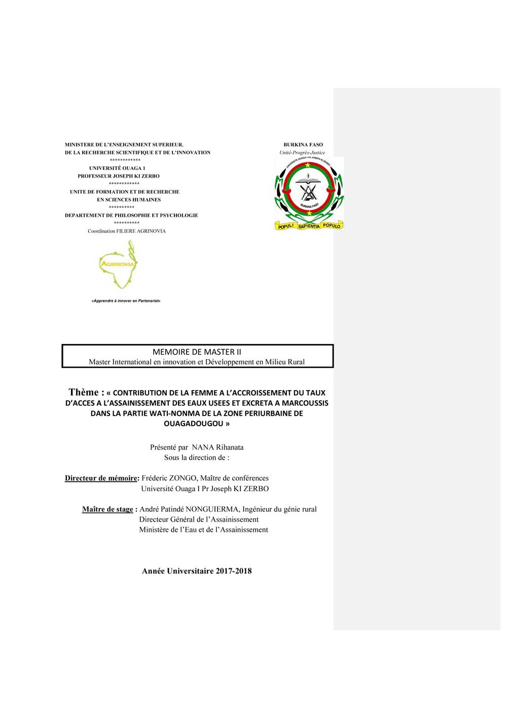 Contribution de la femme à l’aicrossement du taux d’accès a l’assainissement des eaux usées et excreta a marcoussis dans la partie Wati-Nonma de la zone périurbaine de Ouagadougou