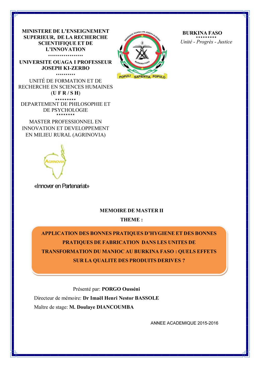 Application des bonnes pratiques d’hygiène et des bonnes pratiques de fabrication dans les unités de transformation du manioc au Burkina Faso: quels effets sur la qualité des produits derives?