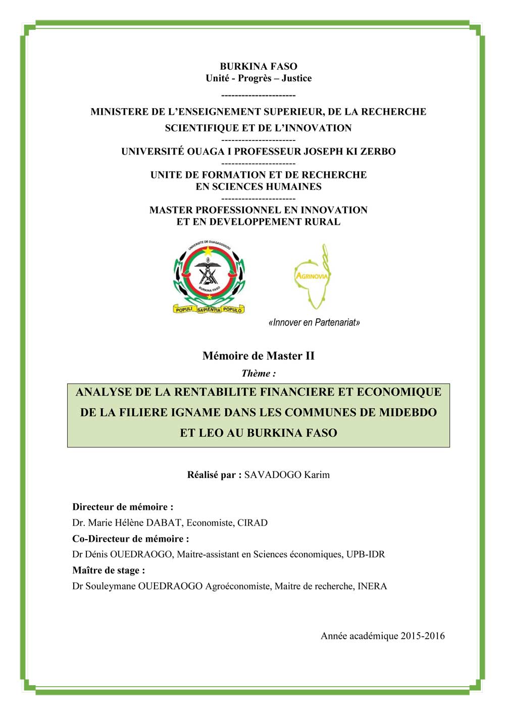 Analyse de la rentabilité financière et économique de la filiere igname dans le communes de Midebdo et Leo au Burkina Faso