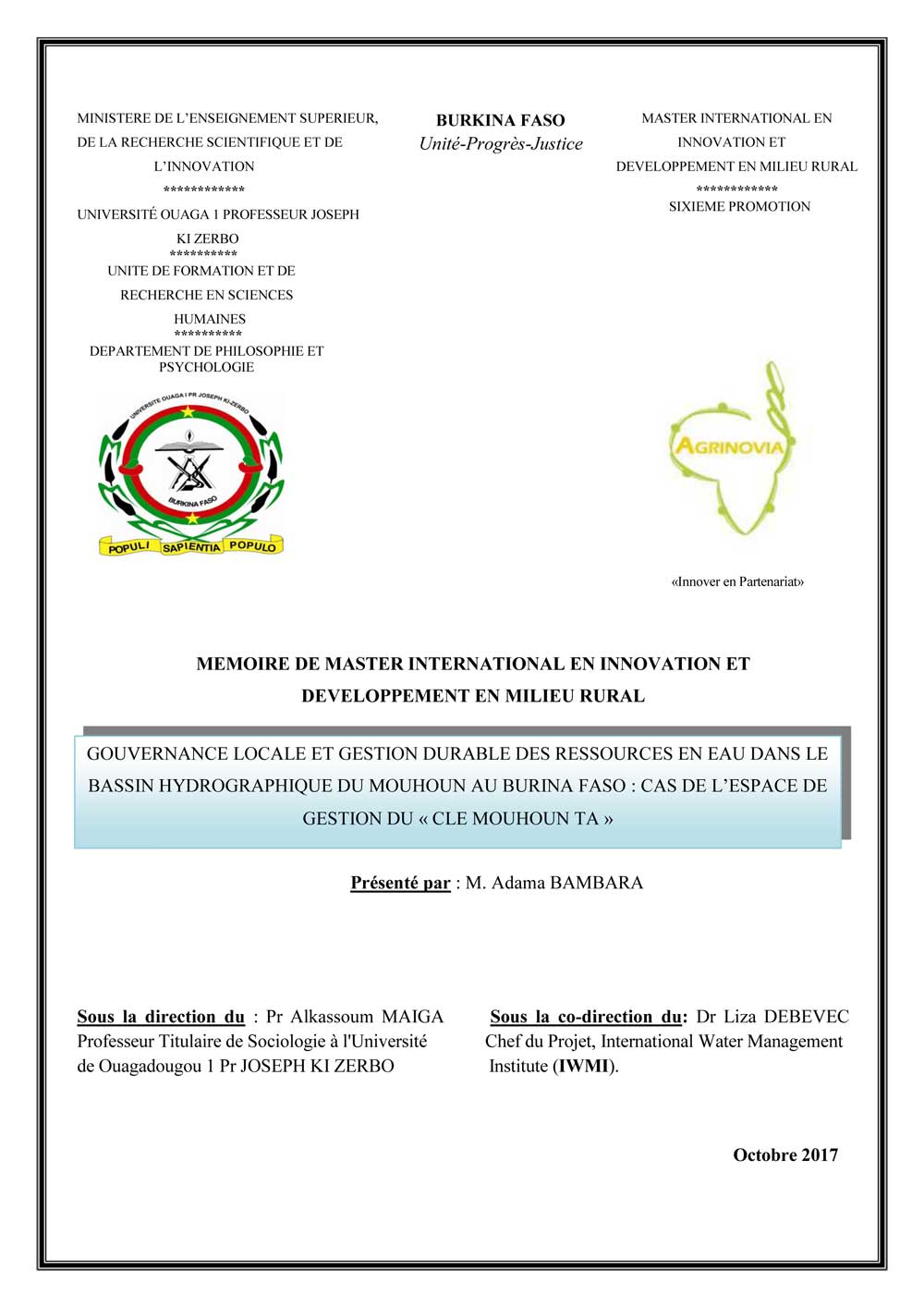 Gouvernance Locale et gestion durable des ressources en eau dans le bassin hydrographique du Mouhoun au Burkina Faso: cas de l’espace de gestion du « CLE MOUHOUN TA »