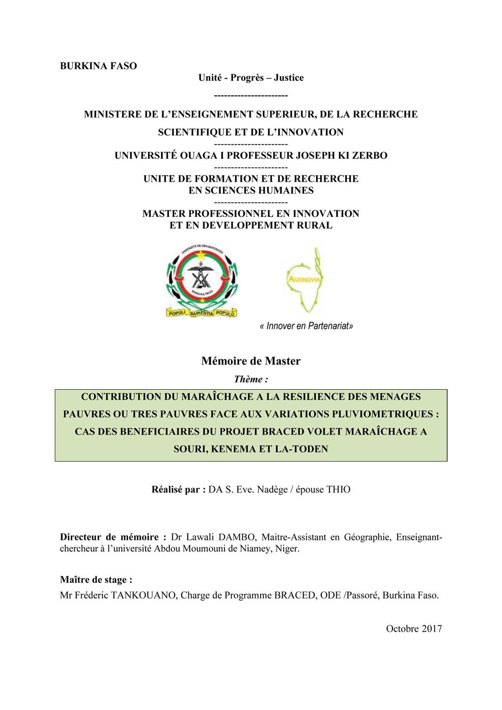 Contribution du Maraichage a la résilience des menages pauvres ou très pauvres face aux variations pluviométriques: cas de bénéficiaires du projet braced volet maraichage a Souri, Kenema et La-Toden