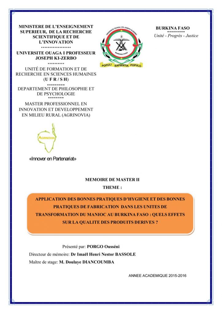 Application des bonnes pratiques d’hygiène et des bonnes pratiques de fabrication dans les unités de transformation du manioc au Burkina Faso: quels effets sur la qualité des produits derives?
