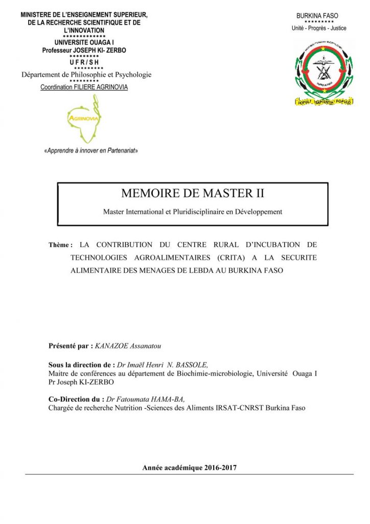 La contribution du centre rural d’incubation de technologies agroalimentaires (CRITA) à la sécurité alimentaire des menages de Lebda au Burkina Faso